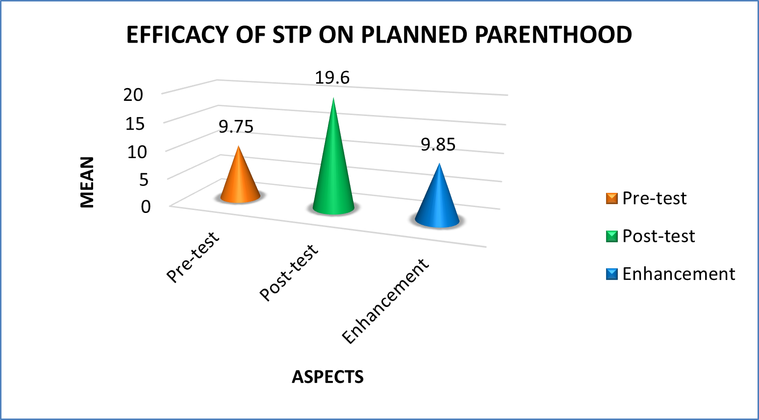 The participants exhibited a mean pre-test knowledge score of 9.75, corresponding to a mean percentage of 32.5%, indicating a comparatively low initial understanding of Planned Parenthood. After participating in the STP for an hour, their mean post-test knowledge score rose significantly to 19.60, which accounts for 66.66%. This improvement of roughly 9.85 points signifies a notable enhancement in knowledge due to the educational intervention. Applying the paired t-test analysis demonstrated a highly significant difference between pre-test and post-test scores, with a ***p-value < 0.001, falling well below the standard significance threshold of 0.05. Therefore, Hypothesis H1 is validated and accepted, confirming that the STP had a statistically significant impact on students’ knowledge levels regarding Planned Parenthood. This result supports research showing structured educational interventions effectively increase awareness and understanding of parenthood. Education on Planned Parenthood is essential for enabling young adults to make informed reproductive and sexual health decisions.
